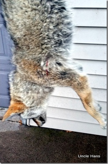 Apparently, there is no season on coyote in Wisconsin and the consensus at the bar is that they should be shot on sight.  She was probably a yearling, had not done very well hunting during a somewhat harsh winter, was very hungry and possible sick, and shooting her was a good choice.